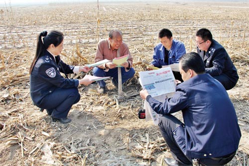 為了將《中華人民共和國大氣污染防治法》和《五臺縣人民政府嚴(yán)防森林火災(zāi)的通告》宣傳到戶、到人,五臺縣環(huán)保局組織工作人員,分組劃片深入到田間地頭,面對面讀報給農(nóng)民聽,為農(nóng)民解釋燒秸稈、燒荒等野外違規(guī)用火行為的危害。臺城鎮(zhèn)西關(guān)村66歲的農(nóng)民張存在說:“你們這樣解釋,咱懂。我家4畝地的秸稈保證不燒一根?!眻D為五臺縣環(huán)保局工作人員在田間地頭宣傳環(huán)境保護相關(guān)知識。(金俊賢 辛宇 攝影報道)