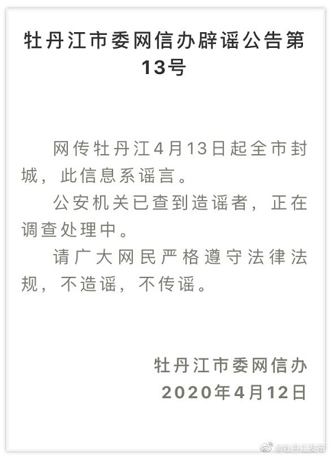 網(wǎng)傳牡丹江4月13日起全市封城,此信息系謠言。公安機關已查到造謠者,正在調查處理中。請廣大網(wǎng)民嚴格遵守法律法規(guī),不造謠,不傳謠。
