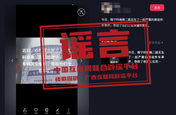 真相:近期,有網(wǎng)民在短視頻平臺上發(fā)布視頻稱“某派出所三人在路口巡邏中,突然車輛發(fā)生爆炸,導(dǎo)致三位民警全部犧牲”。經(jīng)南寧公安部門調(diào)查,該信息為謠言。網(wǎng)民韋某為吸引關(guān)注,杜撰此條謠言信息,并利用手機(jī)進(jìn)行發(fā)布。根據(jù)《中華人民共和國治安管理處罰法》第二十五條,屬地公安機(jī)關(guān)已依法對韋某處以行政處罰。(來源:廣西互聯(lián)網(wǎng)辟謠平臺、南寧網(wǎng)警)