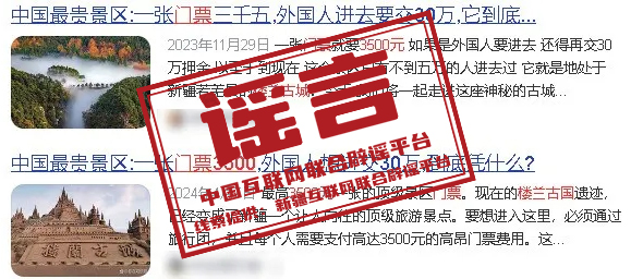 真相:近日,社交媒體平臺(tái)上流傳“新疆樓蘭故城一張門票3500元”“羅布泊門票20元”等信息,甚至有網(wǎng)民給樓蘭故城冠以“中國(guó)最貴景區(qū)”的名頭,引發(fā)關(guān)注。對(duì)此,樓蘭故城遺址所在地新疆若羌縣“若羌文旅”官方賬號(hào)辟謠稱,“樓蘭故城3500元門票”“羅布泊20元門票”的說(shuō)法都是假的。樓蘭故城從未對(duì)外開放過(guò),廣大游客若想了解樓蘭文化,可以到若羌縣樓蘭博物館進(jìn)行了解。此外,羅布泊是無(wú)人區(qū),禁止非法穿越。(來(lái)源:“新疆網(wǎng)絡(luò)辟謠”微信公眾號(hào))