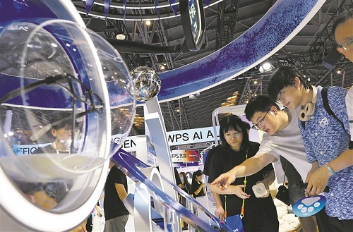 參觀者在2025世界人工智能大會現(xiàn)場的一個智能眼鏡展臺前交流討論。新華社記者 方喆攝