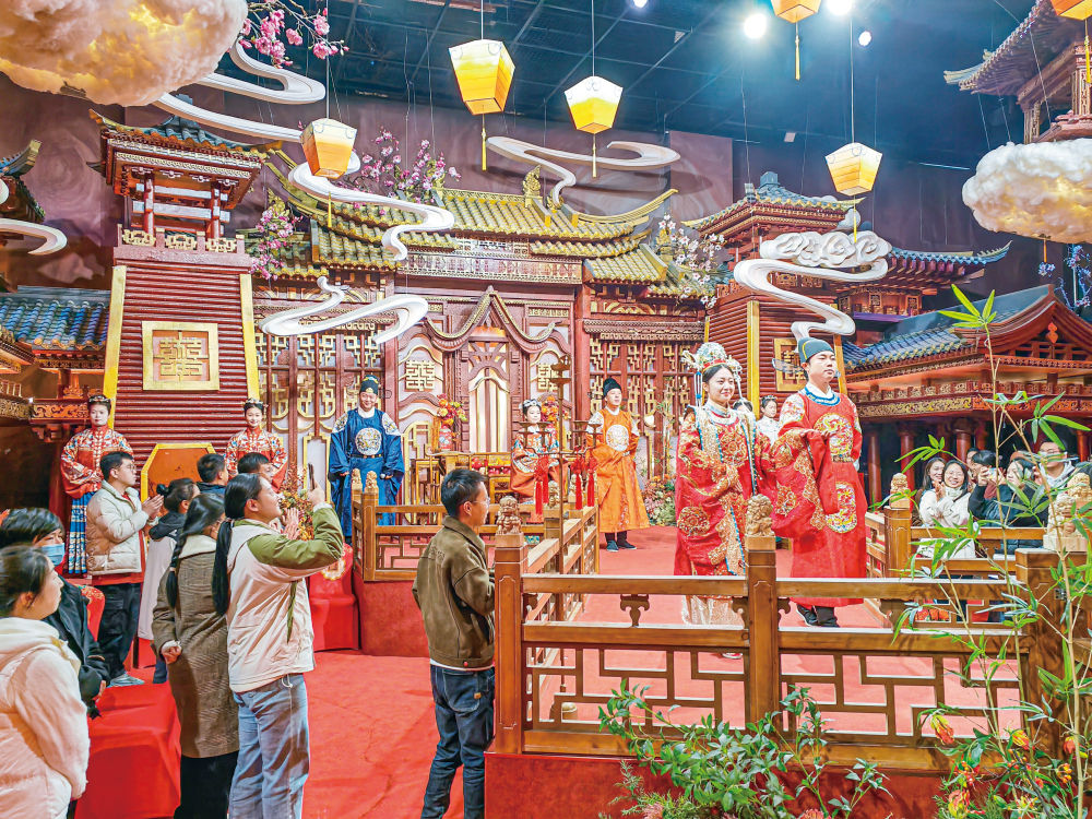現(xiàn)在村里不僅可以提供周、漢、唐、宋、明等不同禮制的中式傳統(tǒng)婚禮服務(wù),景區(qū)日常還上演著迎賓禮、出閣禮、正婚禮等表演,讓客戶下單前就可以提前審視自己婚禮的效果。部分古民居經(jīng)過修繕裝修開設(shè)的民宿,還分成了“男方院”“女方院”,方便全套迎親流程在這里展開。