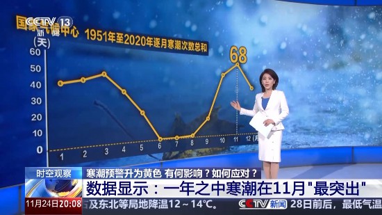 從國家氣候中心“1951年至2020年逐月寒潮次數(shù)總和”的數(shù)據(jù)中就可以看到:一年之中,寒潮在11月表現(xiàn)最突出,1951到2020年在我國一共出現(xiàn)了68次,相反在6到7月,則一次都沒有露面。