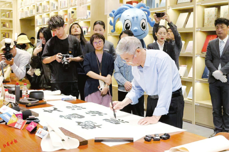 3.在深圳圖書(shū)館北館,“山西姥爺”揮毫潑墨。