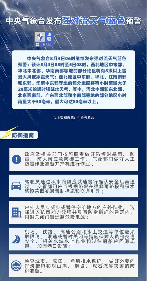 8月4日6時(shí),中央氣象臺發(fā)布暴雨橙色、高溫橙色、強(qiáng)對流藍(lán)色三預(yù)警: