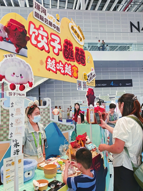 胖乎乎的餃子、圓墩墩的醋缸,摸一摸,毛絨絨的,手感柔順細(xì)滑。8月24日,第七屆山西文博會現(xiàn)場,位于山西瀟河國際會展中心N4館的文創(chuàng)山西展區(qū),永濟市晉韻原創(chuàng)文創(chuàng)工作室獨特而醒目的門頭——“餃子蘸醋 越吃越富”,吸引了眾多參觀者的目光。該工作室展出的餃子蘸醋系列毛絨文創(chuàng)產(chǎn)品,也受到參觀者的關(guān)注和喜愛。