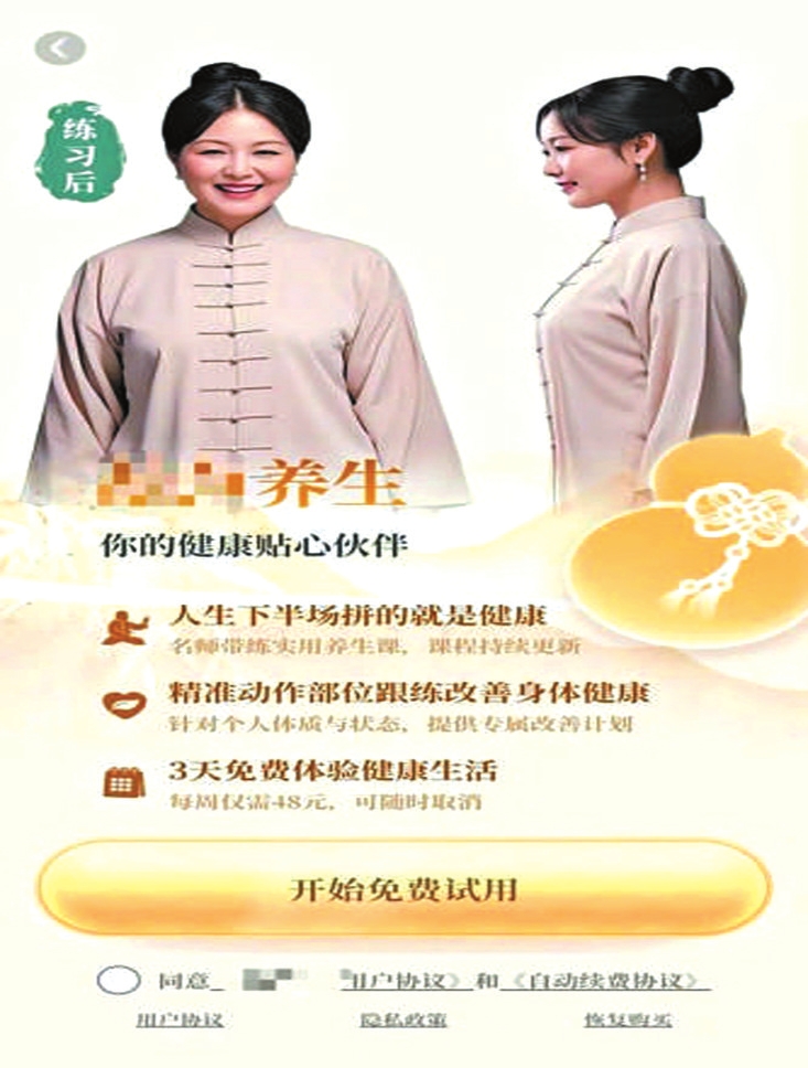 還有些App則更加離譜,下載完成后,點(diǎn)進(jìn)去的第一步就是要購(gòu)買(mǎi)會(huì)員,之后才能正常使用。但在購(gòu)買(mǎi)流程上,平臺(tái)卻耍起了花招。比如一款提供“養(yǎng)生指導(dǎo)服務(wù)”的App,頁(yè)面上會(huì)有一個(gè)大大的按鈕,寫(xiě)著“開(kāi)始免費(fèi)試用”。但在按鈕的旁邊,卻有一行非常不起眼的小字:“每周僅需48元,可隨時(shí)取消。”而一旦用戶(hù)點(diǎn)擊開(kāi)始試用,系統(tǒng)就會(huì)跳轉(zhuǎn)到自動(dòng)續(xù)費(fèi)的開(kāi)通界面。如果是辨別能力差的老人,可能還以為是在填寫(xiě)什么注冊(cè)信息。