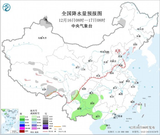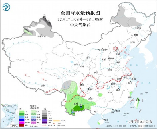 全國降水量預(yù)報圖(12月16日08時-17日08時) 12月17日08時至18日08時,內(nèi)蒙古東北部、黑龍江西南部、新疆北部、川西高原南部等地部分地區(qū)有小到中雪或雨夾雪,其中,新疆阿勒泰地區(qū)和伊犁河谷局地有大到暴雪(10~16毫米)。西南地區(qū)南部、湖南西部、福建東北部、廣西西北部、海南島西南部等地部分地區(qū)有小到中雨,其中,云南東南部局地有大雨(25~35毫米)。西藏中北部等地部分地區(qū)有4~6級風(fēng);東海南部海域、臺灣海峽、巴士海峽、南海東北部和中東部海域?qū)⒂?~7級大風(fēng)、陣風(fēng)8級。