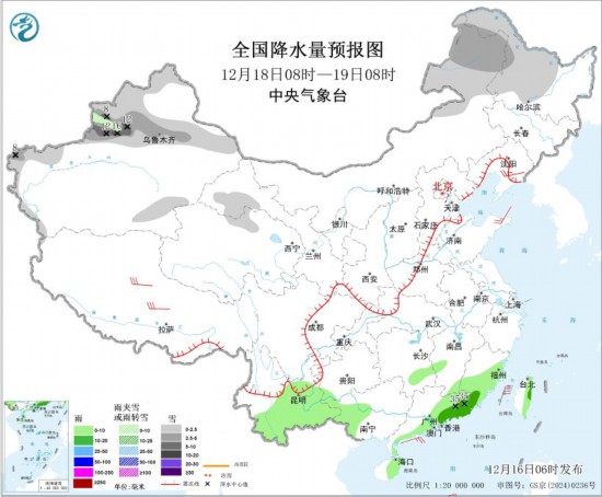全國降水量預(yù)報圖(12月17日08時-18日08時) 12月18日08時至19日08時,內(nèi)蒙古東北部、黑龍江中北部、新疆北部和南疆西部山區(qū)、甘肅河西等地部分地區(qū)有小到中雪或雨夾雪,其中,新疆沿天山地區(qū)和伊犁河谷局地有大到暴雪(10~16毫米)。湖南南部、福建東部和南部、西南地區(qū)南部、廣西西南部、廣東東部和南部、海南島東部、臺灣島東部等地部分地區(qū)有小到中雨,其中,廣東東部局地有大雨(25~35毫米)。遼寧東部、西藏中北部等地部分地區(qū)有4~6級風(fēng);臺灣海峽、巴士海峽、南海東北部和中東部海域?qū)⒂?~7級大風(fēng)、陣風(fēng)8級。