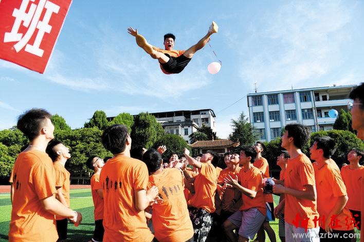 7月4日,湖南省永州市藍(lán)山縣第二中學(xué)的高三學(xué)生將同學(xué)拋起。