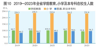 全年全省研究生教育招生2.1萬人,在學(xué)研究生6.1萬人,畢業(yè)生1.6萬人。普通本科招生14.7萬人,在校生55.1萬人,畢業(yè)生13.8萬人。職業(yè)本專科招生13.8萬人,在校生41.2萬人,畢業(yè)生12.5萬人。中等職業(yè)教育招生13.8萬人,在校生41.6萬人,畢業(yè)生13.5萬人。普通高中招生21.2萬人,在校生67.8萬人,畢業(yè)生22.1萬人。初中招生37.1萬人,在校生112.2萬人,畢業(yè)生34.9萬人。小學(xué)招生39.9萬人,在校生231.8萬人,畢業(yè)生37.9萬人。特殊教育招生0.4萬人,在校生2.0萬人,畢業(yè)生0.4萬人。學(xué)前教育在園幼兒91.8萬人。(圖10)