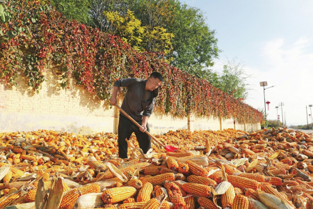 10月14日,原平市新原街道桃園村,村民緊抓晴好天氣晾曬玉米。褚震攝