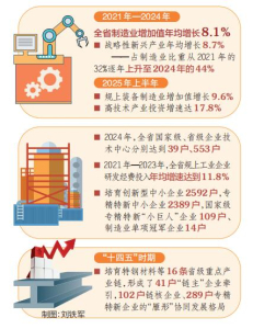 統(tǒng)計(jì)數(shù)據(jù)顯示,2021年—2024年,全省制造業(yè)增加值年均增長(zhǎng)8.1%,戰(zhàn)略性新興產(chǎn)業(yè)年均增長(zhǎng)8.7%,占制造業(yè)比重從2021年的32%逐年上升至2024年的44%。2025年上半年全省規(guī)上裝備制造業(yè)增加值增長(zhǎng)9.6%,高技術(shù)產(chǎn)業(yè)投資增速達(dá)17.8%,戰(zhàn)略性新興產(chǎn)業(yè)對(duì)工業(yè)增長(zhǎng)貢獻(xiàn)率日漸提高。