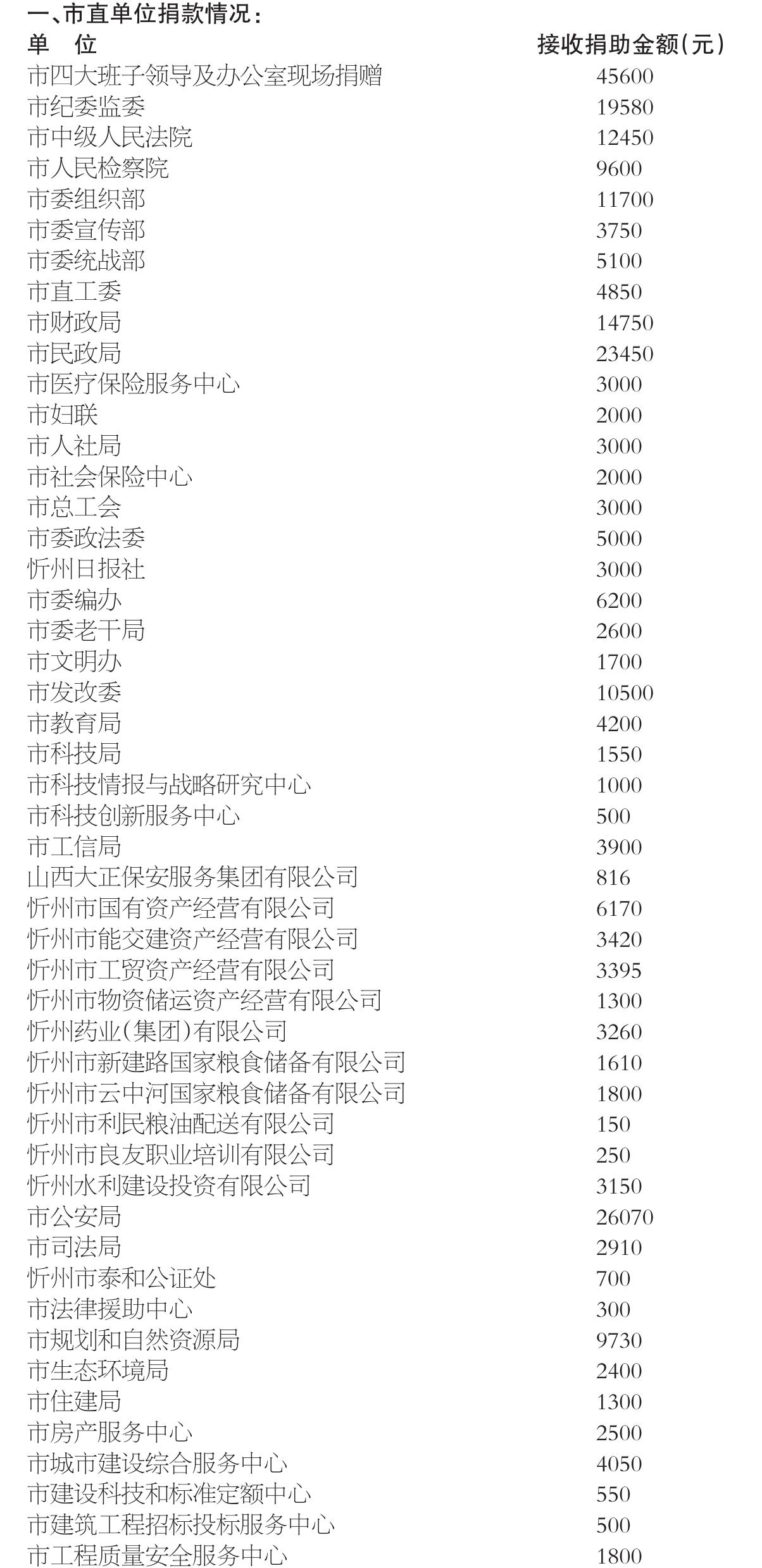 2024年11月22日,市委、市政府辦公室發(fā)出《關(guān)于開展“送溫暖、獻(xiàn)愛心”社會(huì)捐助活動(dòng)的通知》,市四大班子領(lǐng)導(dǎo)和機(jī)關(guān)干部率先垂范,各縣(市、區(qū))、各單位高度重視,認(rèn)真組織,廣大干部職工積極響應(yīng),“送溫暖、獻(xiàn)愛心”社會(huì)捐助活動(dòng)有效開展。截至2025年4月底,市直140個(gè)單位組織干部職工參與捐助,共捐款766388元,各縣(市、區(qū))接收捐款338.09萬元,合計(jì)捐款4147288元,為解決全市人民群眾的生產(chǎn)生活問題起到了積極作用。現(xiàn)將捐助情況公告如下(市直單位以捐助時(shí)間先后為序):