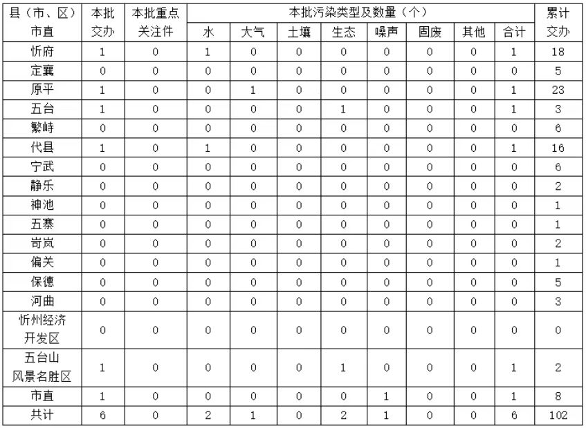 按區(qū)域和部門劃分,忻府區(qū)1件、原平市1件、代縣1件、五臺縣1件、市直單位1件、五臺山風(fēng)景名勝區(qū)1件。本批轉(zhuǎn)辦的信訪件,涉及生態(tài)環(huán)境問題6個,其中,生態(tài)破壞問題2個、水污染問題2個、大氣污染問題1個、噪聲污染問題1個。
