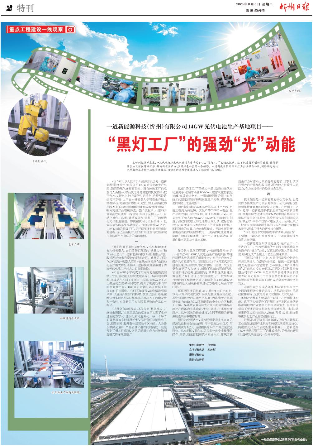 6月24日,步入位于忻州經(jīng)濟(jì)開發(fā)區(qū)的一道新能源科技(忻州)有限公司14GW光伏電池生產(chǎn)車間,強(qiáng)烈的現(xiàn)代感撲面而來。沒有傳統(tǒng)工廠的喧囂與人頭攢動(dòng),取而代之的是精密的機(jī)械韻律:數(shù)百臺(tái)AGV智能小車(自動(dòng)導(dǎo)引運(yùn)輸車)沿著預(yù)設(shè)路線無聲穿梭;上千臺(tái)六軸機(jī)器人手臂在生產(chǎn)線上精準(zhǔn)舞動(dòng),完成硅片的抓取、定位、加工;高精度的在線AOI(自動(dòng)光學(xué)檢測)設(shè)備如同敏銳的“眼睛”,瞬間完成產(chǎn)品瑕疵篩查。整個(gè)流程中,從原料開盒到高效電池片下線包裝,實(shí)現(xiàn)了全程無人化、自動(dòng)化操作。這里,就是被譽(yù)為“黑燈工廠”的現(xiàn)代化光伏制造基地。即使在夜間無照明條件下,也能依靠智能系統(tǒng)高效運(yùn)轉(zhuǎn)。這座總投資60億元、占地474畝的超級工廠,歷經(jīng)兩年多時(shí)間緊鑼密鼓的建設(shè),現(xiàn)已全面投產(chǎn),成為忻州這座傳統(tǒng)能源城市向新質(zhì)生產(chǎn)力躍升的耀眼地標(biāo)。
