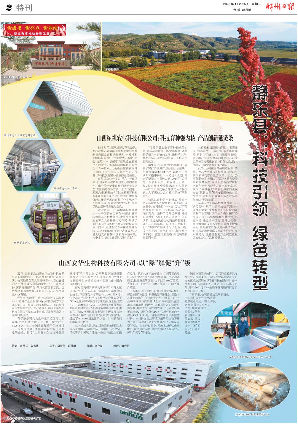 落子靜樂(lè)現(xiàn)代農(nóng)業(yè)產(chǎn)業(yè)示范區(qū)的山西安華生物科技有限公司,是一家專注于PVA(PVOH)生物全降解薄膜環(huán)保新材料——水溶性薄膜、包裝膜降解塑料研發(fā)制造的企業(yè)。作為“山西首家全生物降解膜新材料”投產(chǎn)的企業(yè),公司從起步階段便聚焦推動(dòng)傳統(tǒng)塑料產(chǎn)品的綠色轉(zhuǎn)型,致力于打破國(guó)外在該領(lǐng)域的技術(shù)壟斷,填補(bǔ)國(guó)內(nèi)市場(chǎng)的空白。