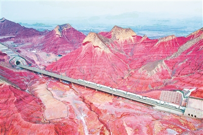 圖為1月18日,一列動(dòng)車組列車行駛在蘭州市境內(nèi)的丹霞地貌群中。