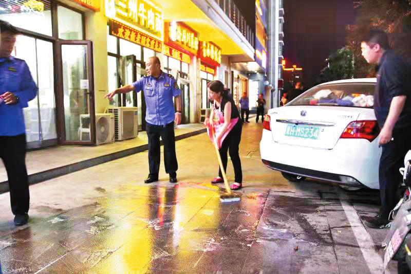 據(jù)了解,此次行動共出動執(zhí)法人員近30名。通過專項整治,進一步規(guī)范了城區(qū)商鋪的經營秩序,提升了居民的環(huán)保意識和文明意識,營造了和諧文明的市容環(huán)境。圖為執(zhí)法人員與商家一同清理店鋪門前油污。(記者張志遠 攝影報道)