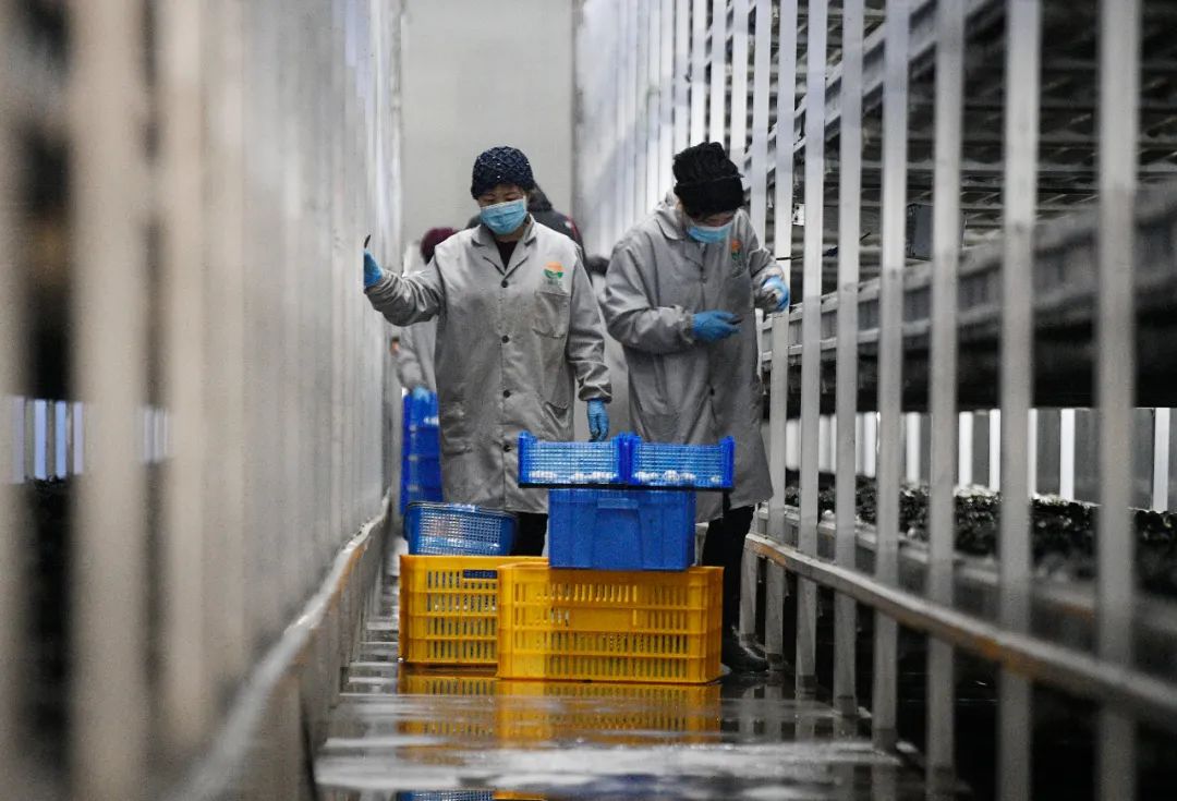 △寧夏銀川市永寧縣閩寧鎮(zhèn)雙孢菇栽培示范基地,農(nóng)民在采摘蘑菇。
