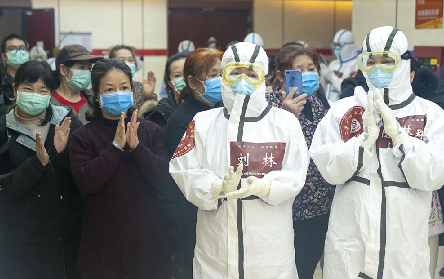2020年3月8日,女性醫(yī)護人員和女性患者共同參加武昌方艙醫(yī)院內(nèi)“三八”婦女節(jié)活動 (新華社記者熊琦 攝)