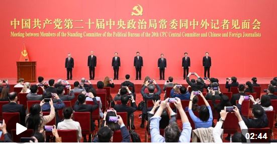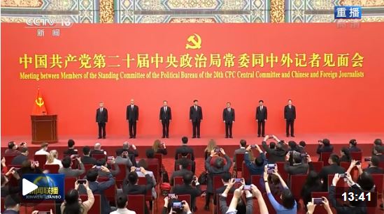 10月23日,剛剛在黨的二十屆一中全會(huì)上當(dāng)選的新一屆中共中央政治局常委,在人民大會(huì)堂同采訪中共二十大的中外記者親切見(jiàn)面。