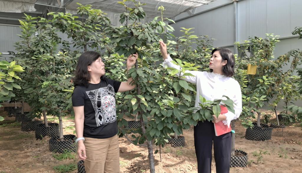 新路村黨支部書(shū)記、村委會(huì)主任劉翠萍與“櫻桃樹(shù)下”種植園有關(guān)負(fù)責(zé)人察看櫻桃長(zhǎng)勢(shì)。張林泉 攝