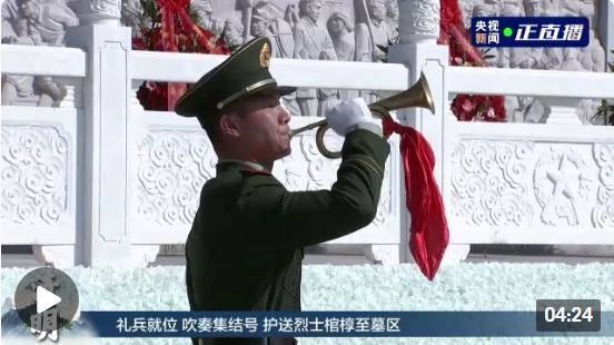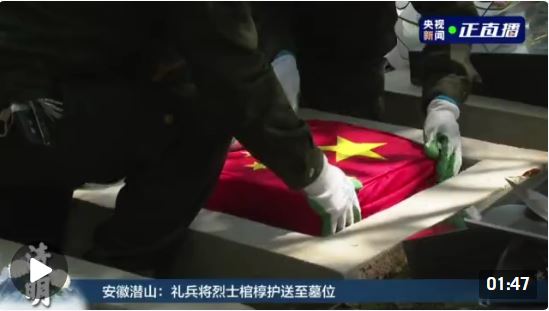 禮兵手捧、護送烈士棺槨至墓區(qū)