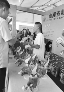 開幕式前,提前一兩個小時安檢入場的觀眾,遠遠就看到“翔翔”的召喚,紛紛在吉祥物專營區(qū)扎堆?!?8元一個,就剩30個了。”專營區(qū)的售賣者告訴山西晚報記者,他們也沒想到這只褐馬雞如此受歡迎,很快就要被搶沒了。大同的趙女士搶到一個,她說朋友從外地剛回來不方便出門,讓她買一個留作紀念。