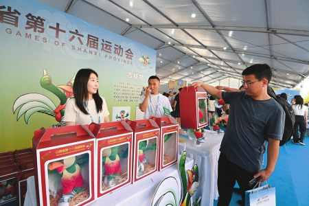 8月9日,大同市體育中心內(nèi),第十六屆省運(yùn)會(huì)吉祥物(翔翔)專營(yíng)區(qū)吸引不少觀眾前來(lái)選購(gòu)。