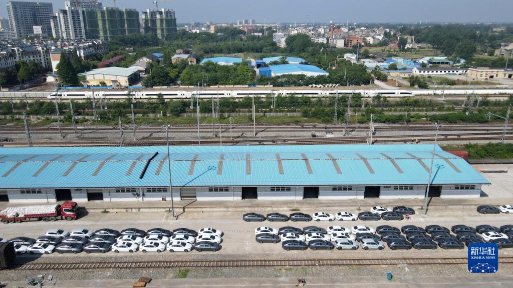 這是位于合肥市長豐縣的鐵路水家湖貨運(yùn)站等待裝車外運(yùn)的新能源汽車(5月9日,無人機(jī)照片)。新華社記者 劉軍喜 攝