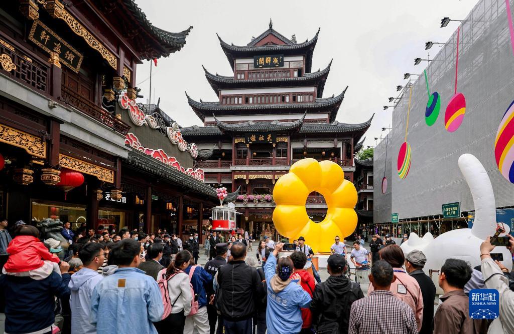 5月7日,市民游客在上海豫園商城中心廣場觀看街頭藝術(shù)表演。新華社記者 劉穎 攝