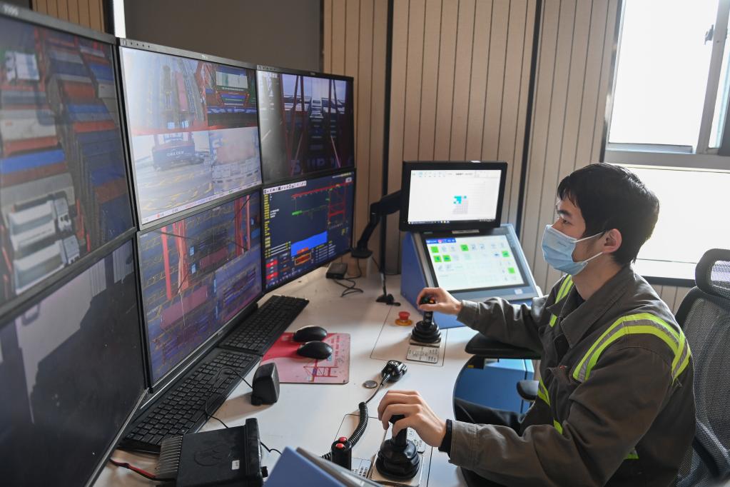 圖為寧波舟山港梅山港區(qū),橋吊司機在操作橋吊遠(yuǎn)程控制系統(tǒng)。新華社記者黃宗治 攝