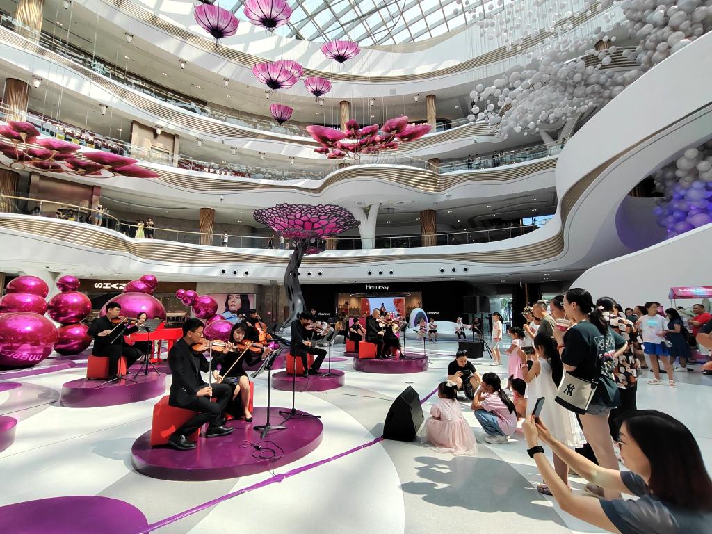 端午假期,??趪?guó)際免稅城內(nèi),伴隨著悠揚(yáng)的音樂(lè),陽(yáng)光傾瀉“天際秘林”夢(mèng)幻舞臺(tái),正在購(gòu)物的游客們紛紛駐足欣賞。“一場(chǎng)室內(nèi)音樂(lè)會(huì),給購(gòu)物消費(fèi)增添了新意和氛圍感。”??谑忻耜惱俪两陉?yáng)光和音樂(lè)中。