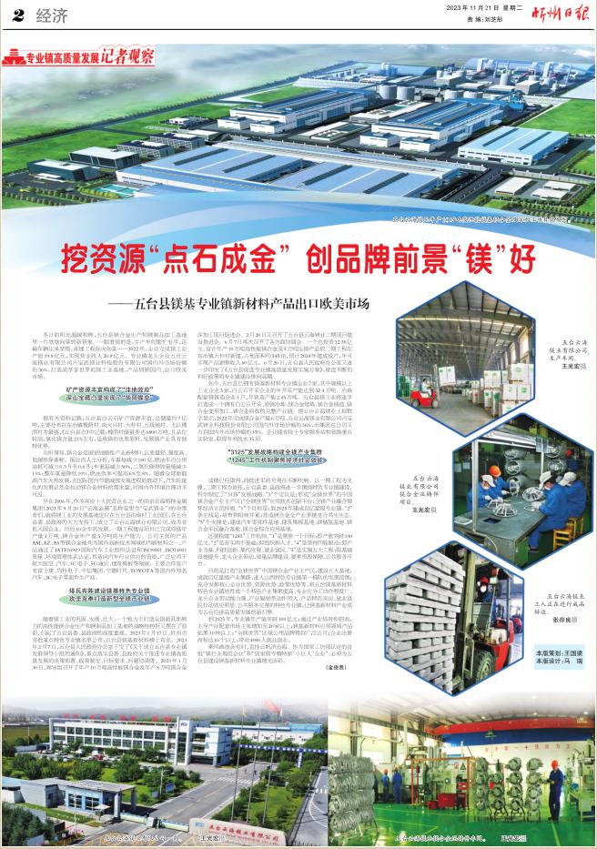 如今,五臺縣委、縣政府以一期項(xiàng)目工程為支撐,二期項(xiàng)目工程為依托,進(jìn)一歩圍繞特色專業(yè)鎮(zhèn)建設(shè),科學(xué)制定了“3125”發(fā)展戰(zhàn)略。“3”個(gè)定位是:形成全鎂世界的中國鎂合金產(chǎn)業(yè)主產(chǎn)區(qū)、全鎂世界應(yīng)用技術(shù)創(chuàng)新平臺、全鎂產(chǎn)業(yè)融合循環(huán)經(jīng)濟(jì)示范樣板;“1”個(gè)目標(biāo)是:到2025年建成百億量級專業(yè)鎮(zhèn);“2”條主線是:培育和招商并重、營造鎂合金全產(chǎn)業(yè)多鏈競合共生生態(tài);“5”個(gè)支撐是:建成汽車零部件基地、建筑模板基地、鎂儲氫基地、鎂合金軍民融合基地、鎂合金綜合應(yīng)用基地。該縣還構(gòu)建了“1245”工作機(jī)制?!?”是聚焦一個(gè)目標(biāo):產(chǎn)值突破100億元;“2”是夯實(shí)兩個(gè)基礎(chǔ):組織和人才;“4”是堅(jiān)持四輪驅(qū)動(dòng):產(chǎn)業(yè)為基、科技創(chuàng)新、集約發(fā)展、就業(yè)富民;“5”是實(shí)施五大工程:基礎(chǔ)設(shè)施提升、龍頭企業(yè)帶動(dòng)、質(zhì)量品牌建設(shè)、要素資源保障、公共服務(wù)平臺。五臺縣將鎂產(chǎn)業(yè)融入宇宙產(chǎn)業(yè)發(fā)展空間,申報(bào)“全鎂世界”區(qū)域公用商標(biāo),讓五臺鎂產(chǎn)業(yè)進(jìn)一步走向世界。 (金俊賢)