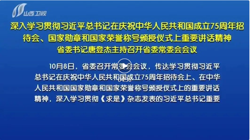 山西日報報道 10月8日,省委召開常委會會議,傳達學(xué)習(xí)貫徹習(xí)近平總書記在慶祝中華人民共和國成立75周年招待會上、在中華人民共和國國家勛章和國家榮譽稱號頒授儀式上的重要講話精神,深入學(xué)習(xí)貫徹《求是》雜志發(fā)表的習(xí)近平總書記重要文章《大力弘揚偉大愛國主義精神,把強國建設(shè)、民族復(fù)興偉業(yè)不斷推向前進》,聽取上次中央巡視整改工作“回頭看”情況匯報。省委書記唐登杰主持會議并講話。