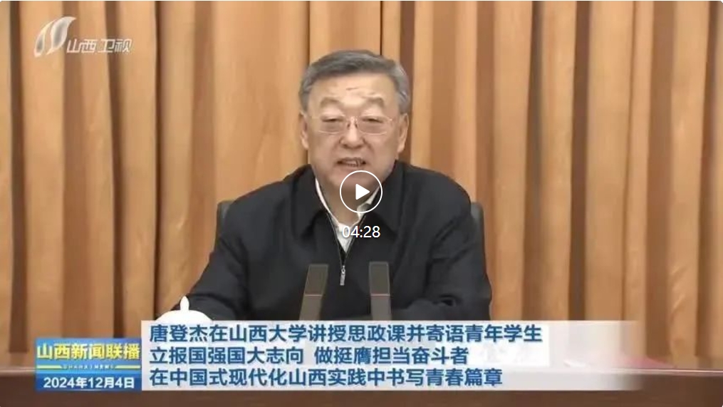 山西日報記者陳俊琦報道 12月3日,省委書記唐登杰來到山西大學(xué)講授思政課,深入學(xué)習(xí)貫徹習(xí)近平新時代中國特色社會主義思想和黨的二十屆三中全會精神,寄語全省廣大青年學(xué)生牢記領(lǐng)袖殷殷囑托,立報國強國大志向、做挺膺擔當奮斗者,在中國式現(xiàn)代化山西實踐中書寫青春篇章。省委常委、秘書長李鳳岐參加。