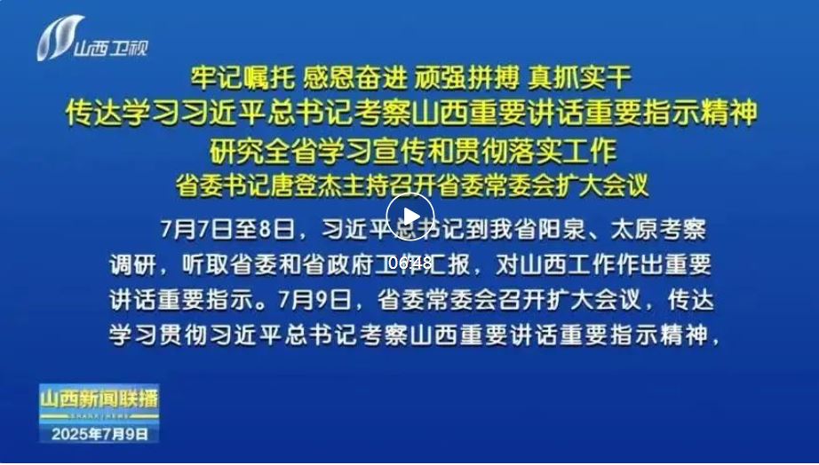 7月7日至8日,習近平總書記到我省陽泉、太原考察調(diào)研,聽取省委和省政府工作匯報,對山西工作作出重要講話重要指示。7月9日,省委常委會召開擴大會議,傳達學習貫徹習近平總書記考察山西重要講話重要指示精神,認真落實黨中央關于促進中部地區(qū)加快崛起、推動黃河流域生態(tài)保護和高質(zhì)量發(fā)展等戰(zhàn)略部署,堅持穩(wěn)中求進工作總基調(diào),完整準確全面貫徹新發(fā)展理念,統(tǒng)籌好發(fā)展和安全,努力在推動資源型經(jīng)濟轉(zhuǎn)型發(fā)展上邁出新步伐,奮力譜寫三晉大地推進中國式現(xiàn)代化新篇章。省委書記唐登杰主持會議。