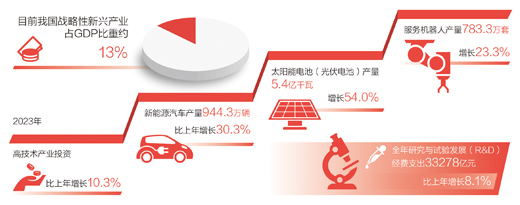 發(fā)展壯大戰(zhàn)略性新興產(chǎn)業(yè)?!皯?zhàn)略性新興產(chǎn)業(yè)具有創(chuàng)新活躍、技術(shù)密集等特點,為新質(zhì)生產(chǎn)力發(fā)展壯大提供了巨大空間?!备呶拇碚f,近年來,我國戰(zhàn)略性新興產(chǎn)業(yè)蓬勃發(fā)展,目前戰(zhàn)略性新興產(chǎn)業(yè)占GDP比重約13%。