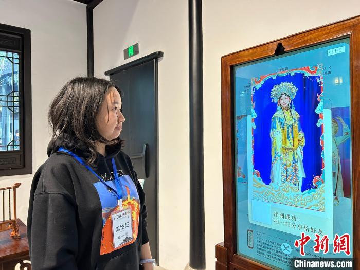 近期,蘇州古城32號(hào)街坊的江蘇按察使署舊址舉辦“匠海拾遺—沉浸式名城非遺文化體驗(yàn)展”。圖為工作人員展示昆曲AI換臉拍照體驗(yàn)過(guò)程。國(guó)璇 攝