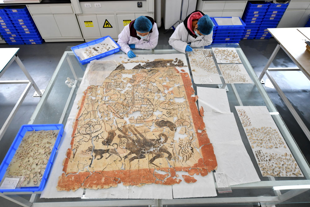 在云岡研究院壁畫文物修復室,工作人員張曉娟(左)、吳朝霞在進行壁畫修復(2021年5月9日攝)。