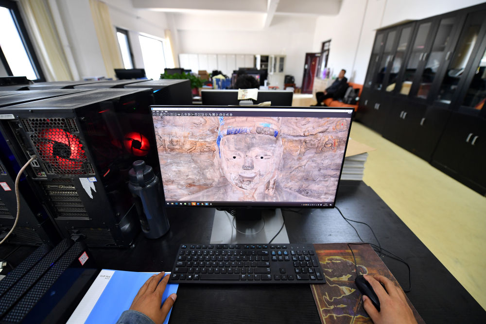 云岡研究院數字化保護中心工作人員在電腦上查看云岡石窟第13窟的模型(2021年5月8日攝)。