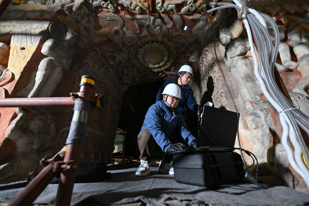 云岡研究院數字化保護中心工作人員潘鵬(前)和同事杜強在云岡石窟第10窟進行數據采集(2024年2月27日攝)。