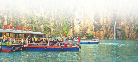 伴隨著他的講解,穿過800米的“時(shí)空隧道”,八泉峽山清水秀的核心地帶就躍然眼前了。3000米長的游船觀光水路時(shí)寬時(shí)窄,順流而下,游船上靜聽水流鳥鳴,看水中游魚穿梭而過,高峽平湖間,隨手一拍即是如畫美景,或碧波蕩漾,或山崖高聳,平靜的湖面與對峙的高山形成鮮明對比,不負(fù)“抬頭張家界,低頭九寨溝”之美名。