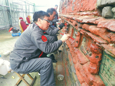 專家正在對(duì)四龍壁進(jìn)行修復(fù)。解州關(guān)帝廟文物保護(hù)所供圖