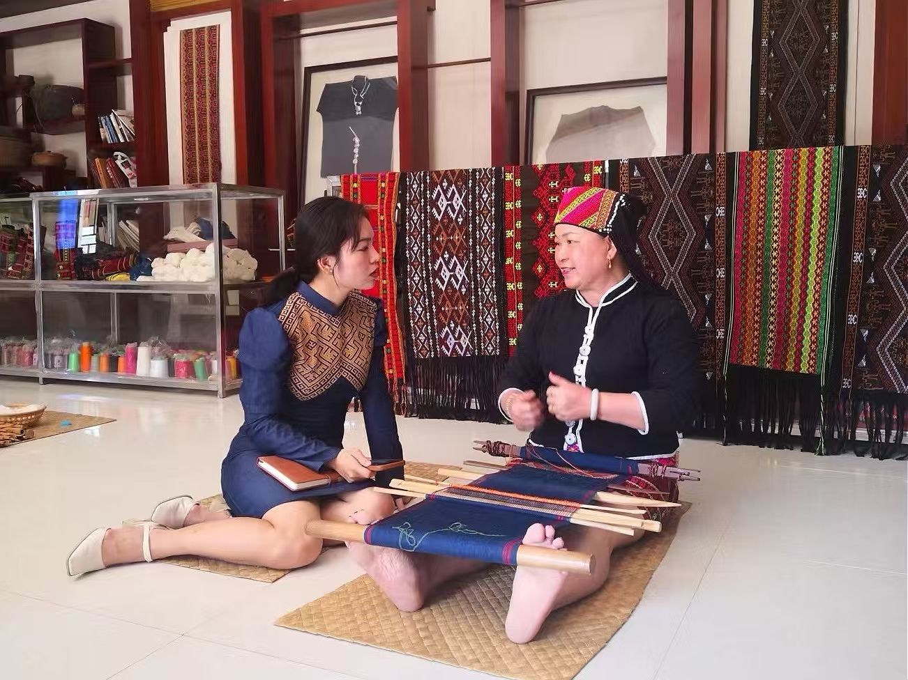 黎族傳統(tǒng)紡染織繡技藝國家級(jí)傳承人劉香蘭(右)正在和陳孟麗(左)交流。 受訪者供圖