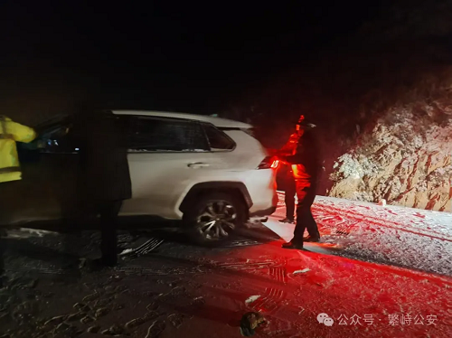2024年11月25日晚18時,繁峙縣公安局指揮中心接到廣東游客趙岸華的報警求助電話,聲稱其一行四人駕車從河北來五臺山旅游,行至太行一號旅游公路神堂堡繁五交界路段時,因風(fēng)雪交加、道路結(jié)冰,車輛和人員被困。接到報警后,指揮中心立即通知神堂堡派出所和交警中隊(duì)前往救助。救援民警頂風(fēng)冒雪順著太行一號旅游公路沿路搜尋,經(jīng)過3個多小時的艱難跋涉,終于在神堂堡鄉(xiāng)盤道村往南約5華里的路上(已屬五臺山風(fēng)景區(qū)地界)找到了被困車輛。當(dāng)時該車燃油即將耗盡,車上四人凍得瑟瑟發(fā)抖,救援民警當(dāng)即將3名乘客轉(zhuǎn)移至警車上,并協(xié)助拖車司機(jī)將被困車輛連上拖車后原路折返,最終在11月26日凌晨2時將被困游客和車輛安全營救回派出所。