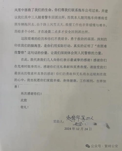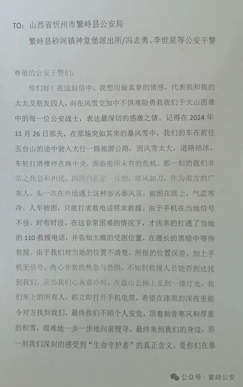 2025年1月1日,繁峙縣公安局收到了來自廣東省佛山市市民趙岸華等4人聯(lián)名寄來的感謝信,信中表達(dá)了對繁峙公安局神堂堡派出所民警頂風(fēng)冒雪深夜馳援,及時救助其脫險的感激之情。