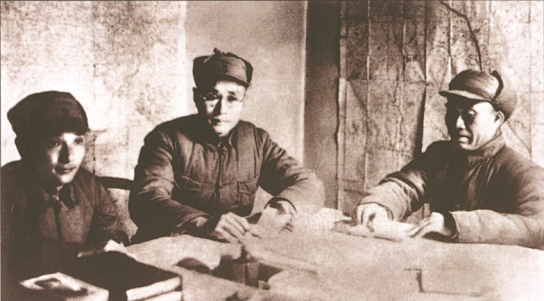 圖9 1937年12月,八路軍第一二九師開辟以太行山為中心的晉冀豫抗日根據(jù)地。圖為朱德(右)與劉伯承(中)、鄧小平(左)在研究根據(jù)地建設。