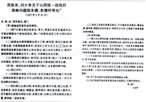 圖1 1937年9月20日,周恩來、劉少奇關于山西統(tǒng)一戰(zhàn)線的策略問題致朱德、彭德懷等電。